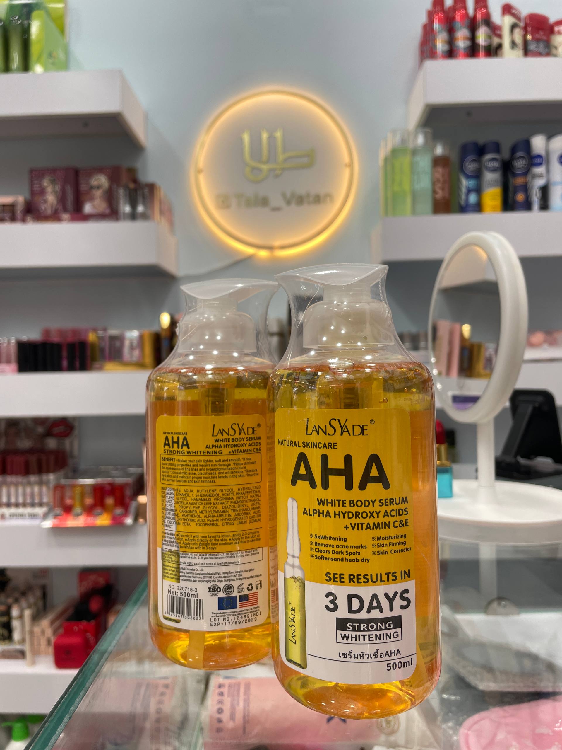 شب‌ها روی پوست تمیز و خشک، ۳ تا ۵ قطره از سرم روشن‌ کننده AHA را به آرامی روی صورت ماساژ دهید تا جذب شود. سپس از مرطوب‌کننده استفاده کنید. در طول روز حتماً از ضد آفتاب استفاده شود.